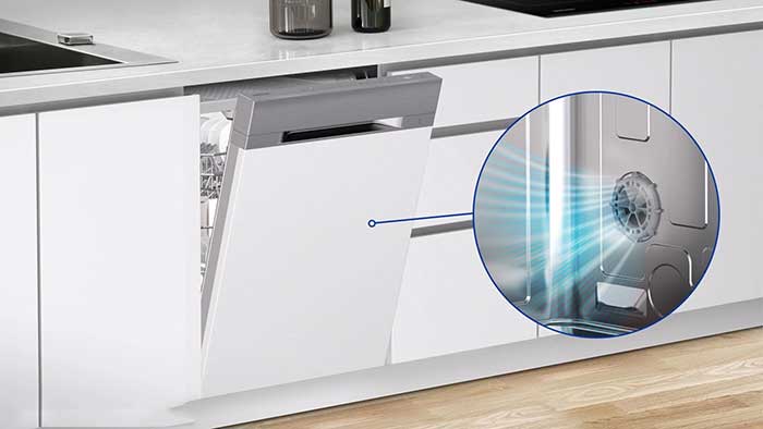 با باز شدن درب ظرفشویی، بخار مودجود در آن به وسیله فن تعبیه شده در داخل ظرفشویی، خارج می شود که این امر سبب خشک شدن سریع ظروف ها می گردد.